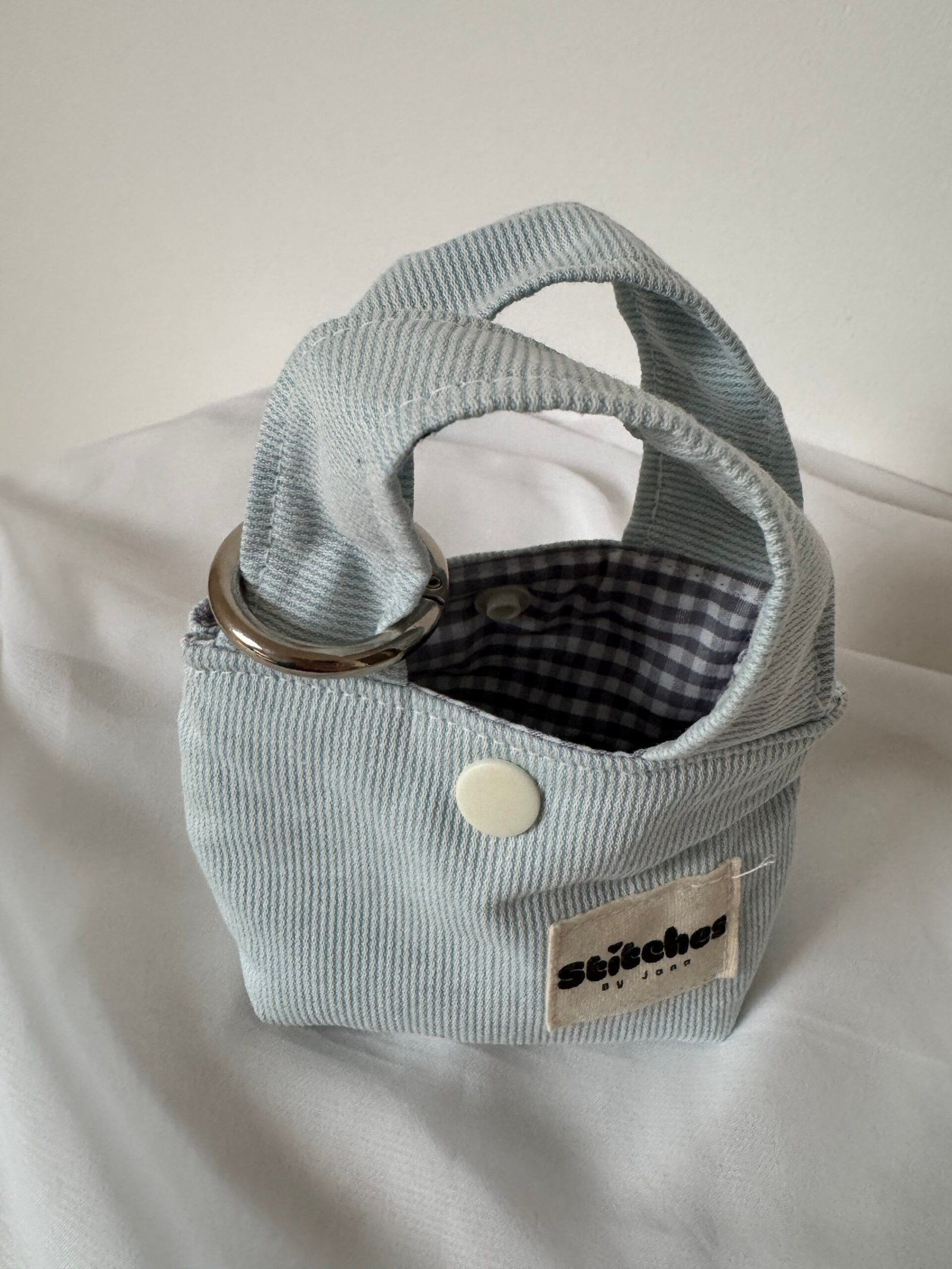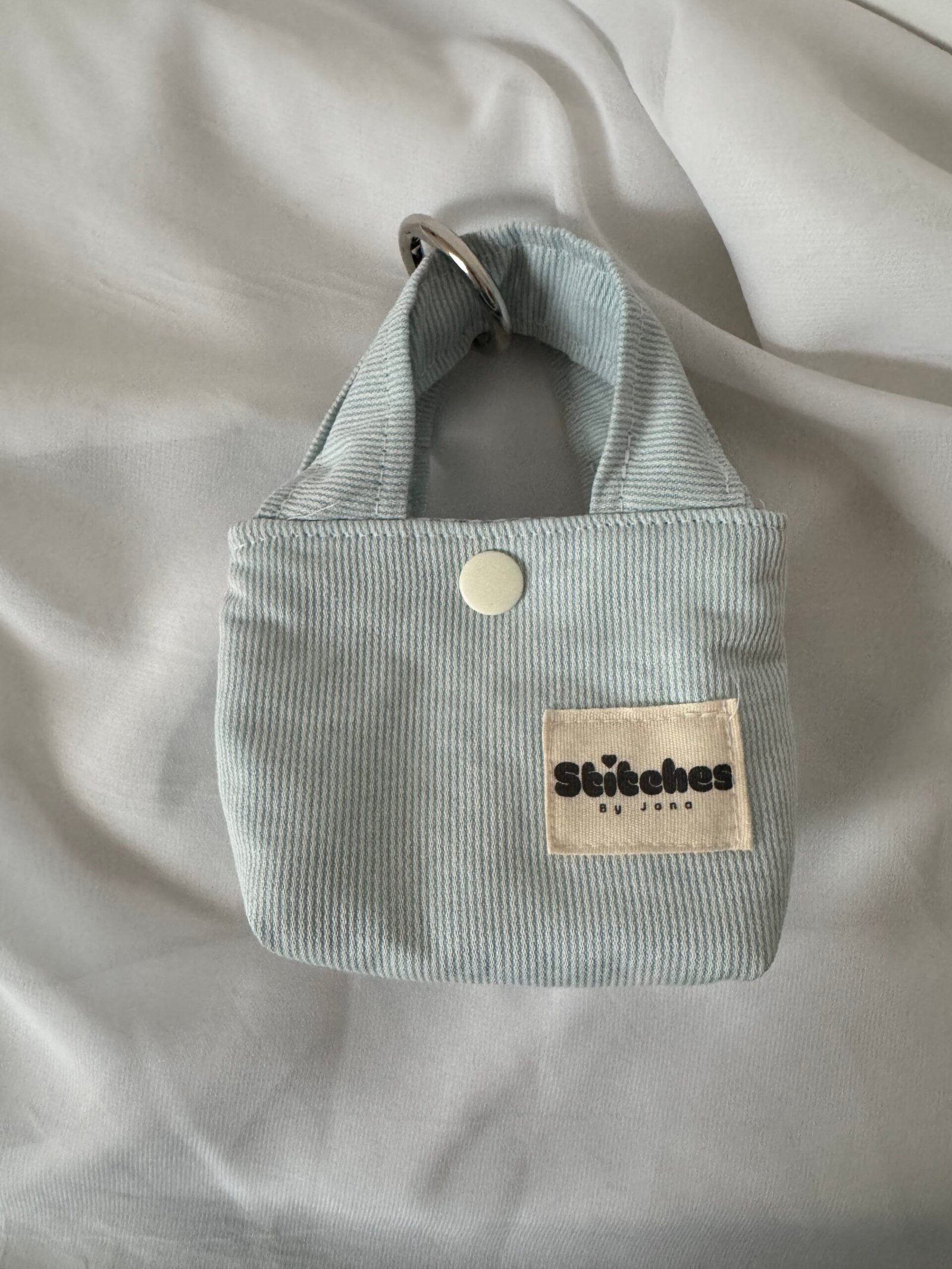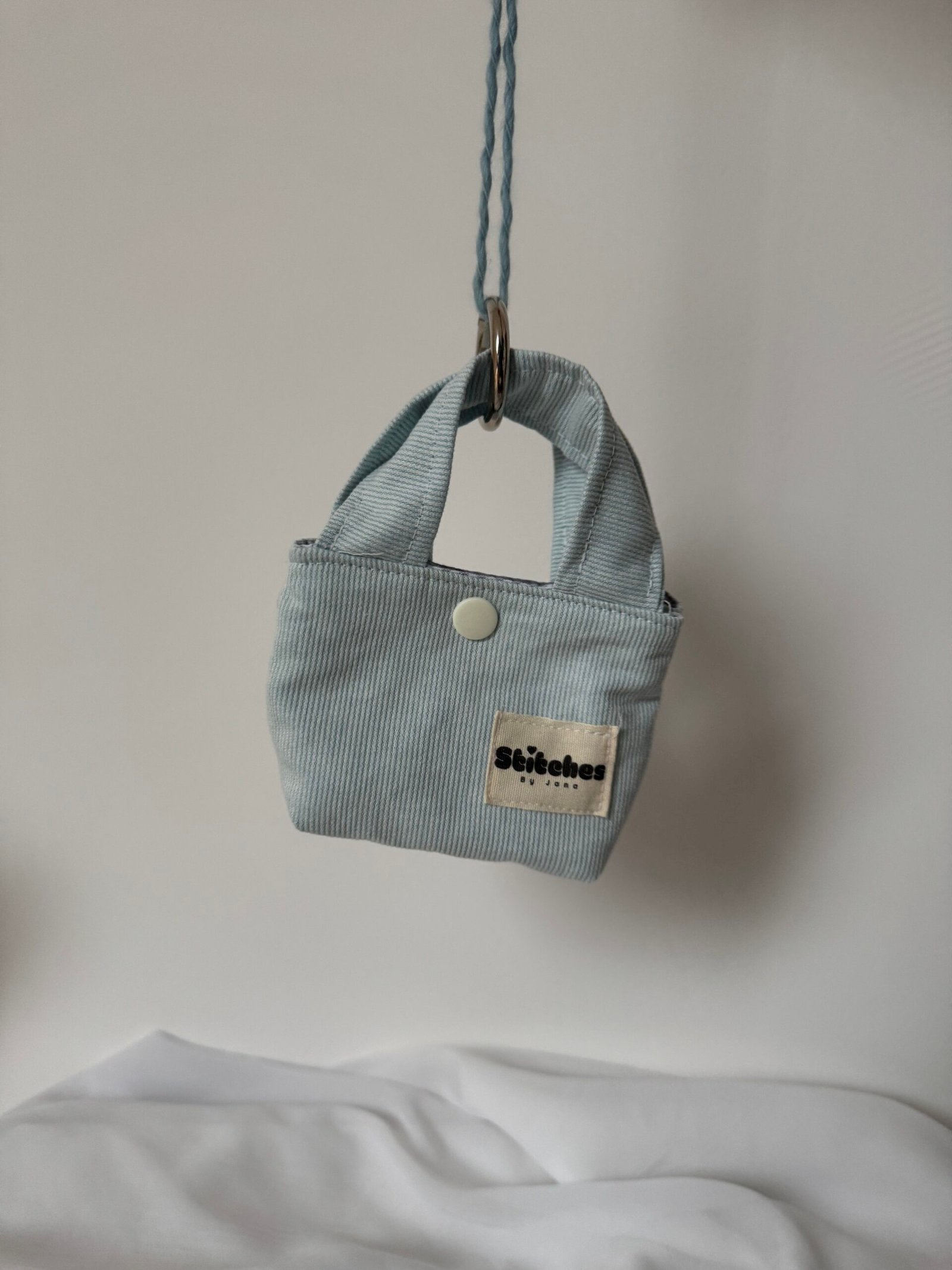 Deze schattige, handgemaakte bag charm in lichtblauw geeft elke tas een speelse en unieke touch. Het mini-tote ontwerp is niet alleen decoratief, maar ook praktisch voor het opbergen van kleine essentials zoals je earpods, lippenbalsem of sleutels.